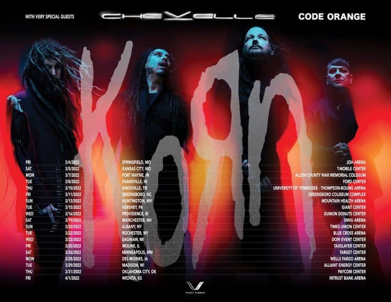 KORN will embark on a headlining tour in March with support from CHEVELLE and CODE ORANGE. Produced by Live Nation, the 19-date arena trek will begin on March 4 in Springfield, Missouri and make stops in Greensboro, Providence and Albany, among other cities, before wrapping up in Wichita, Kansas on April 1.