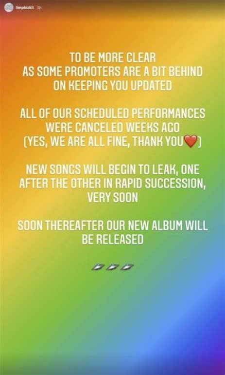 Earlier today (Wednesday, August 25), LIMP BIZKIT shared the following statement via Instagram Story: “To be more clear, as some promoters are a bit behind on keeping you updated. All of our scheduled performances were canceled weeks ago (yes, we are all fine, thank you). New songs will begin to leak, one after the other in rapid succession very soon. Soon thereafter, our new album will be released.”